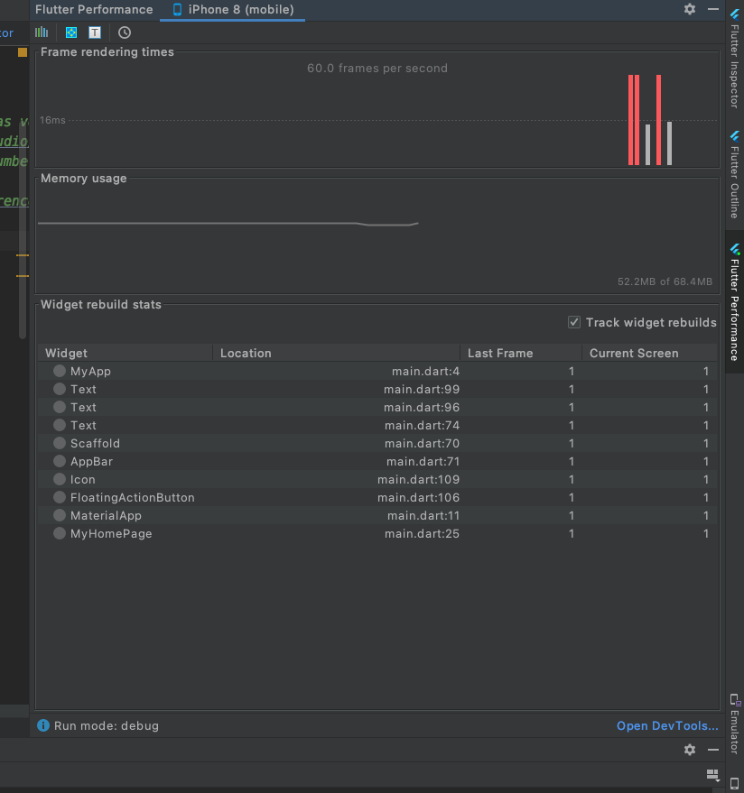 Chức năng đỉnh nhất: Track widget rebuilds. Nó giúp track cái widget bác đang dùng có những thành phần nào đang rerender, render bao nhiêu lần. Nếu có một thành phần đang render nó cũng hiện luôn một cái vòng xoay xoay bên cạnh giúp các bác biết ngay thằng nào đang có dấu hiệu không bình thường